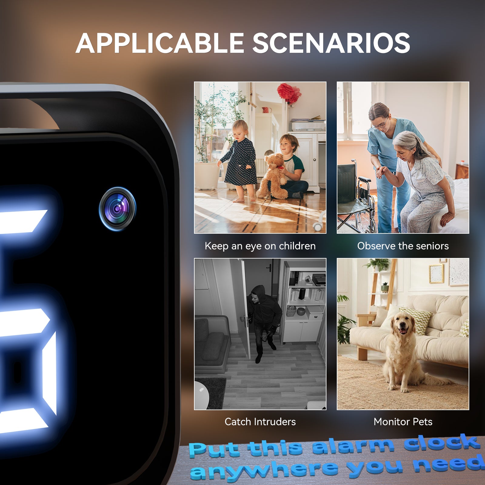 This discreet clock combines surveillance, timekeeping, and environmental monitoring into a single bedside device. The fixed viewing lens angle is 150 degree, which can be adjusted by the rotated frame of this alarm clock
